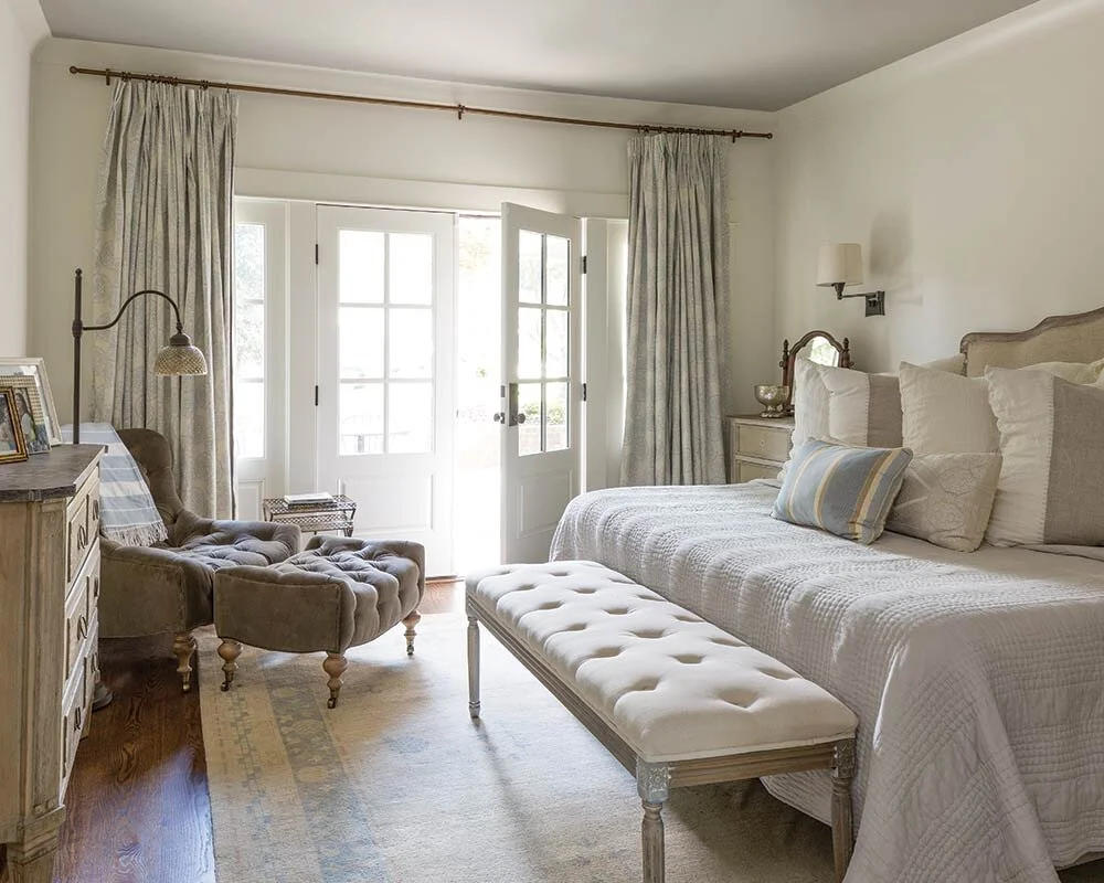 In line with the rest of the home’s calming color scheme, a spa-like master suite is the perfect place to start and end long days. Desiring an outdoor element, the Manns chose to add doors and a wall of windows alongside the bed. “A camellia and two osmanthus trees are just steps outside, which makes the room feel like more of a getaway,” Brittany says. But perhaps the highlight of the suite is the master bathroom, featuring his-and-hers sinks and an expansive marbled-tile shower.